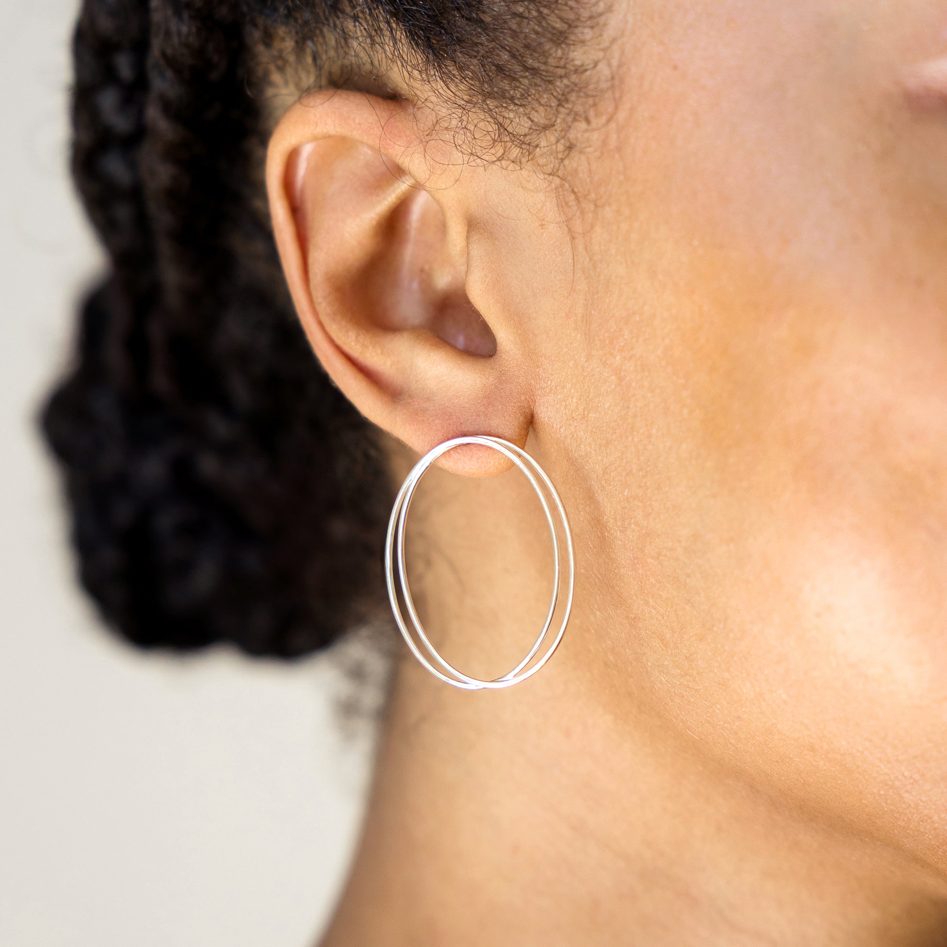 Two thin, overlapping ovals curve around each other for an elegant, geometric earring. Modern, minimal, lightweight statement jewelry.