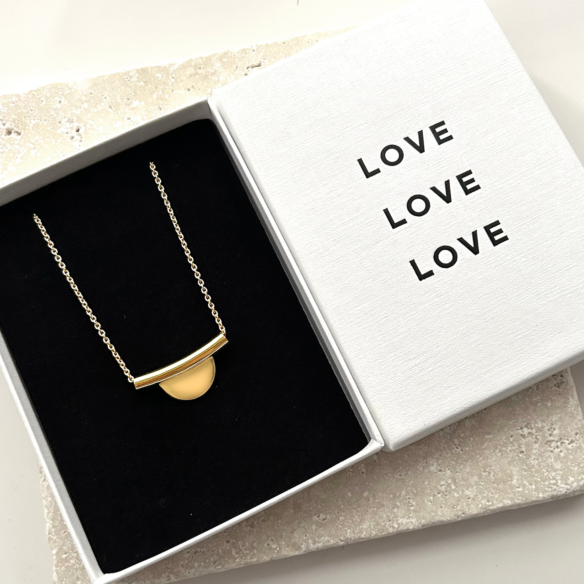 This horizontal necklace is modern and easy to wear every day. Perfect alone or stacked with other necklaces. Elegant and minimal, a soft curve holds a suspended partial circle.