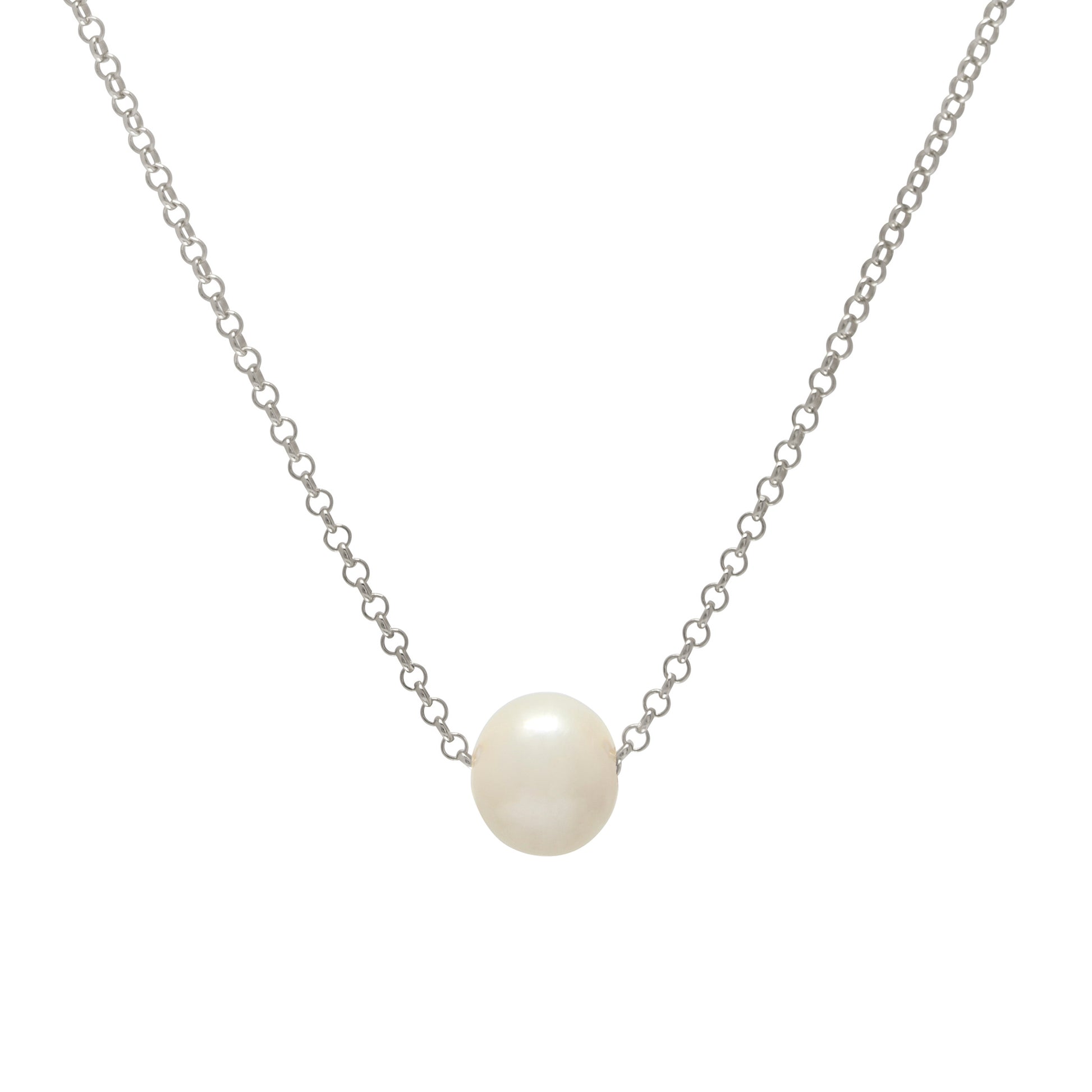 A lustrous, white freshwater pearl floats simply on an elegant chain making this an easy, everyday necklace. With a gorgeous sheen and an iridescent feel, this round, baroque pearl catches the light in every way, and has a luxurious quality.