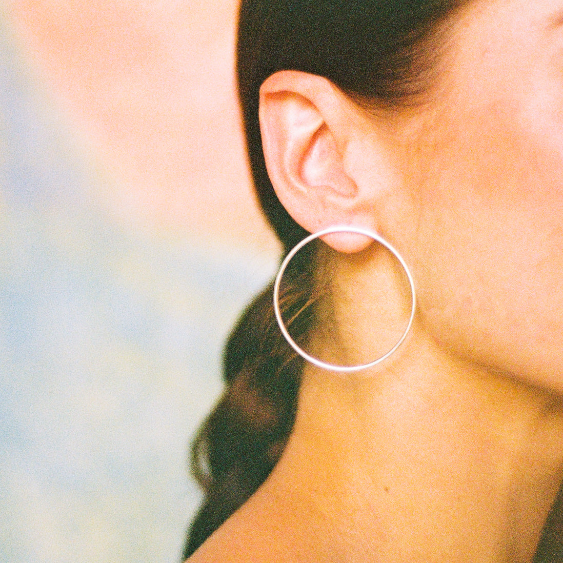 Modern and minimal lightweight statement earrings, a sturdy circle faces forward for a slightly different take on a typical hoop earring. Comfortable enough for everyday wear, these large statement circles are the perfect geometric staple to add to your jewelry box.