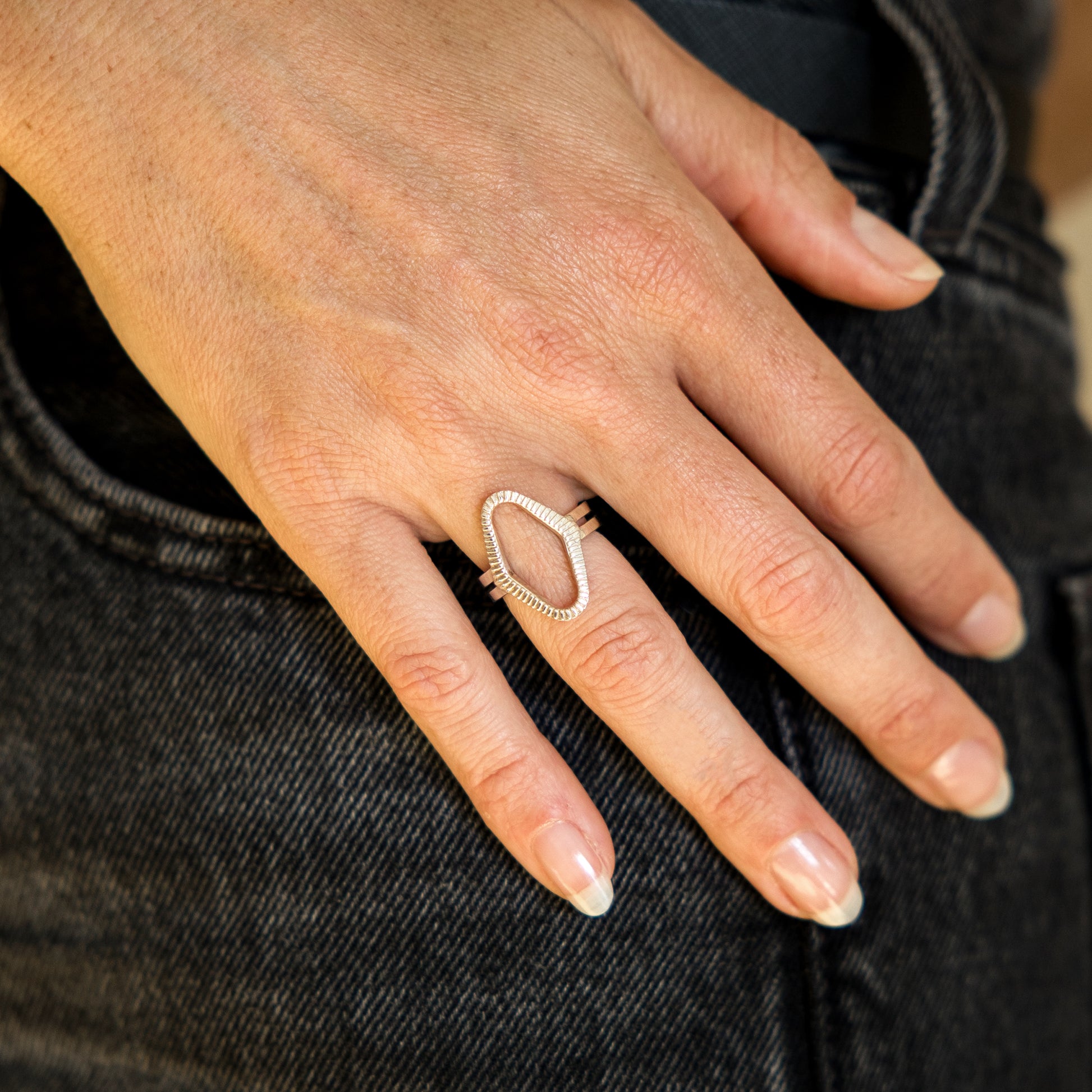 A modern, geometric statement ring with a curving opening that is reminiscent of a snake mouth opening up to bite its prey, so this ring is perfect for the bold, charming, and powerful.