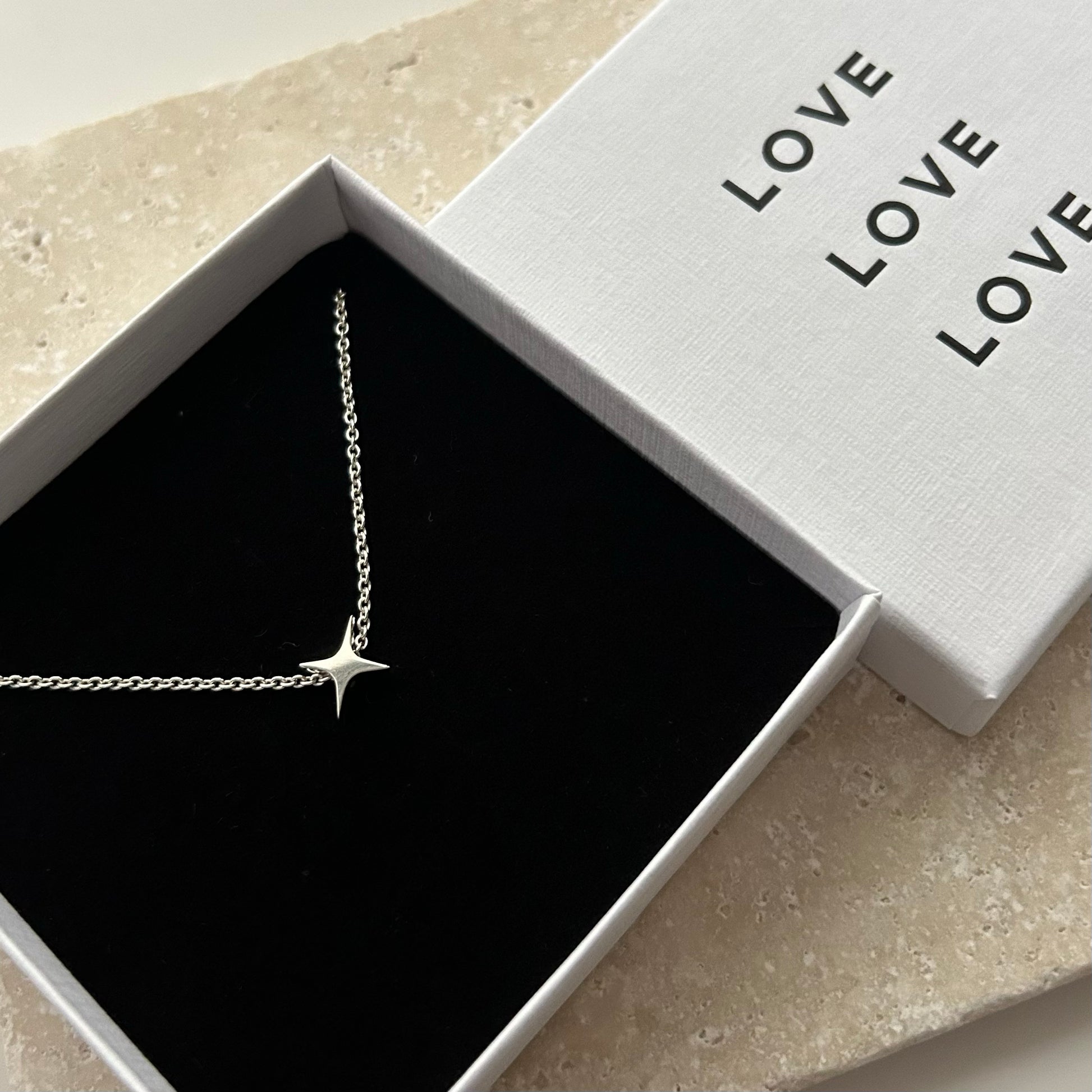 This minimal sparkle star necklace is the perfect way to show your shine. A 4-point atomic starburst slides effortlessly at an angle along a rolo chain, making this necklace perfect for both stacking or wearing alone.