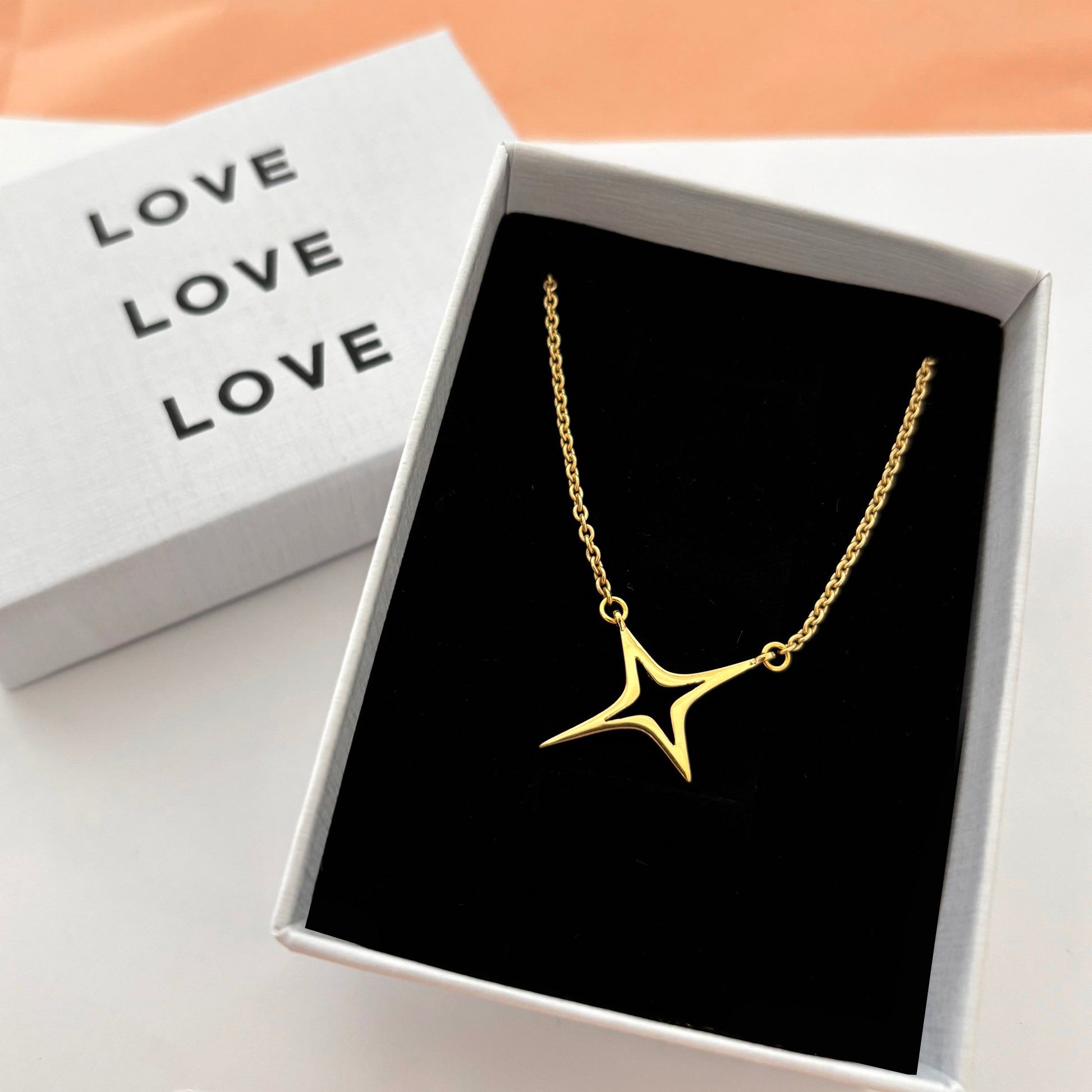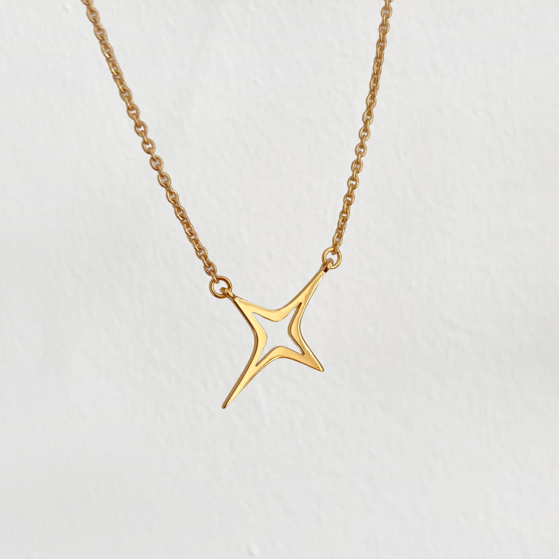 This star necklace is the perfect way to show your sparkle shine. A 4-point atomic starburst with an open silhouette sits in a fixed position on a rolo chain, making this statement necklace perfect for both stacking or wearing alone.