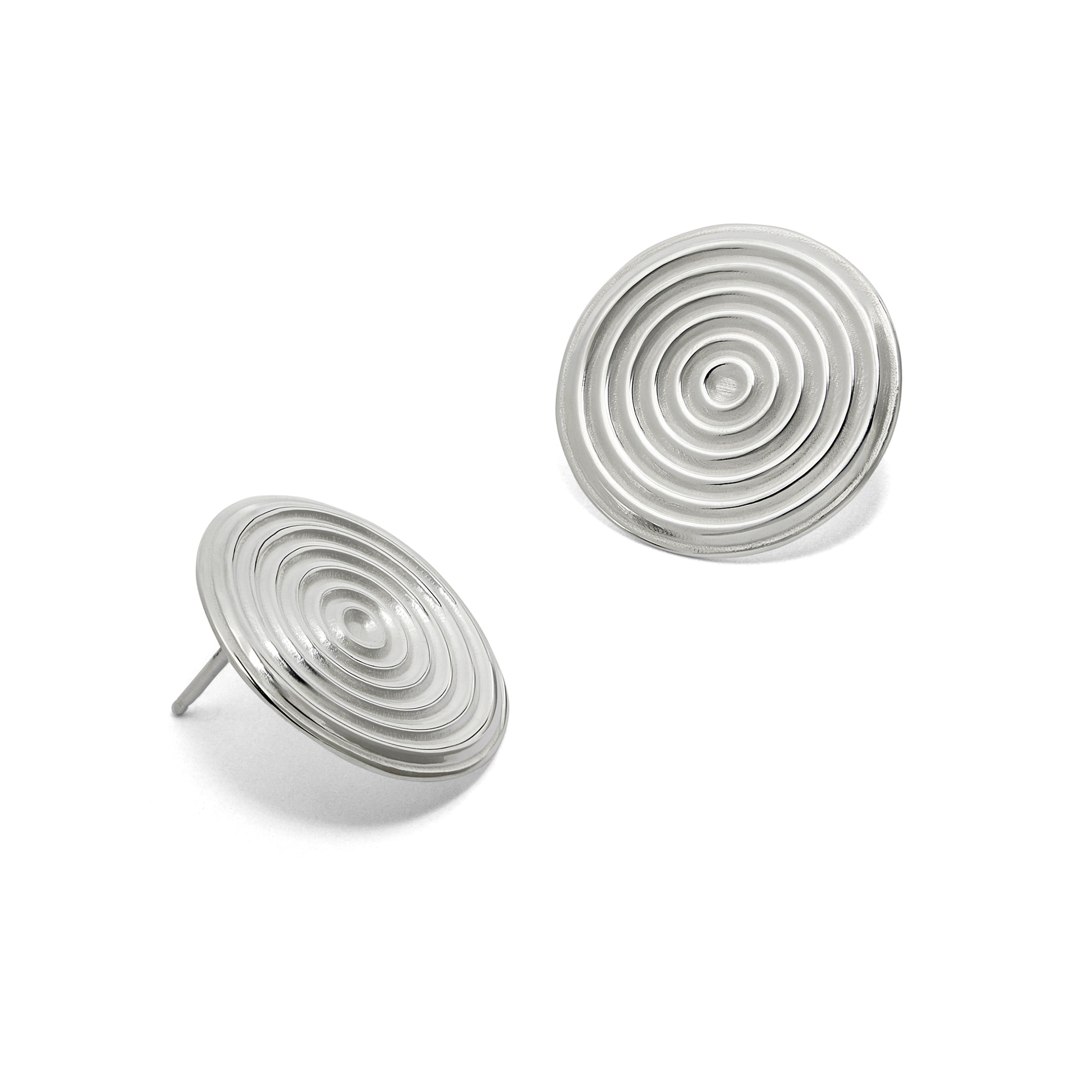 These coin-style earrings feature radiant, concentric circles. Like a zen garden, these earrings are about circular simplicity. The line work pattern has a subtle play to it, like a ripple on water.
